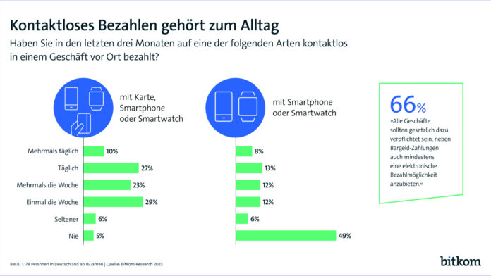 Statt an der Kasse Münzen oder Scheine aus dem Geldbeutel suchen, einfach Bankkarte, Smartphone oder Smartwatch ans Lesegerät halten – der Trend zum kontaktlosen Bezahlen setzt sich ungebrochen fort. In den vergangenen drei Monaten haben 95 Prozent der Deutschen mindestens einmal auf diese Weise bezahlt, vor einem Jahr lag der Anteil noch bei 90 Prozent. 6 von 10 (60 Prozent) nutzen kontaktloses Bezahlen sogar mehrmals die Woche. Das ist eine deutliche Steigerung gegenüber den 50 Prozent aus dem Vorjahr. Das ist das Ergebnis einer repräsentativen Befragung von 1.178 Personen in Deutschland ab 16 Jahren im Auftrag des Digitalverbands Bitkom. Ein Zehntel (10 Prozent) zahlt mehrmals täglich kontaktlos, ein Viertel (27 Prozent) täglich, 23 Prozent mehrmals pro Woche, 29 Prozent einmal die Woche und 6 Prozent seltener. „Immer mehr Menschen nutzen das kontaktlose Bezahlen und sie nutzen es immer häufiger. Viele Läden und Restaurants weisen inzwischen deutlich auf die Möglichkeit hin, da sie allen Beteiligten Vorteile bringt: Der Bezahlvorgang geht schneller, ist bequemer und unterm Strich auch für die Geschäftstreibenden effizienter“, sagt Kevin Hackl, Bereichsleiter Digital Banking & Financial Services beim Bitkom.