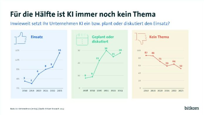 Künstliche Intelligenz erlebt in der deutschen Wirtschaft einen spürbaren Schub. Inzwischen nutzen 15 Prozent der Unternehmen KI, vor einem Jahr waren es erst 9 Prozent. Deutlich zurückgegangen ist gleichzeitig der Anteil derer, für die der KI-Einsatz im eigenen Unternehmen kein Thema darstellt: von 64 auf 52 Prozent. Gut zwei Drittel (68 Prozent) halten KI für die wichtigste Zukunftstechnologie. Dem stehen 29 Prozent gegenüber, die in KI einen Hype sehen, der massiv überschätzt werde. Für das eigene Unternehmen sieht die große Mehrheit von 68 Prozent KI als Chance, ein Fünftel (20 Prozent) jedoch als Risiko. Und jedes Neunte (11 Prozent) denkt, dass KI keinen Einfluss auf das eigene Unternehmen haben wird. Das sind Ergebnisse einer Studie im Auftrag des Digitalverbands Bitkom, für die 605 Unternehmen ab 20 Beschäftigten aus allen Branchen in Deutschland repräsentativ befragt wurden.