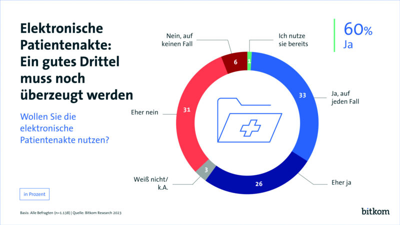 Auf dem Weg hin zu einem digitalisierten Gesundheitssystem spielt die elektronische Patientenakte (ePA) eine zentrale Rolle. In ihr werden unter anderem medizinische Daten, Befunde und Untersuchungen gespeichert, so dass sie für alle Patientinnen und Patienten jederzeit einsehbar sind. Zwar gibt es die ePA bereits seit Januar 2021, allerdings hat sich erst ein Bruchteil der Deutschen (ca. 1 Prozent) eine ePA eingerichtet – vor allem wegen hoher bürokratischer Hürden. Ab 2025 soll daher die so genannte Opt-out-Regelung gelten. Heißt: Alle Versicherten erhalten automatisch eine elektronische Patientenakte – es sei denn, sie widersprechen aktiv. „Die elektronische Patientenakte ist das Kernstück der Digitalisierung des Gesundheitswesens. Mit ihr werden die Menschen informierter, souveräner und können sich besser um ihre eigene Gesundheit kümmern“, betont Bitkom-Präsident Dr. Ralf Wintergerst. „Die Hürden zur Beantragung und Nutzung sind aktuell noch zu hoch. Das vorgesehene Opt-out ist der richtige Weg. Der angekündigte Zeitplan muss jetzt unbedingt eingehalten werden.“ In der aktuellen Bitkom-Befragung geben weitere 59 Prozent an, die ePA nutzen zu wollen – 33 Prozent antworteten „Ja, auf jeden Fall“ und 26 Prozent „eher ja“. Weitere 31 Prozent tendieren zu „eher nein“ wohingegen nur 6 Prozent die Nutzung kategorisch für sich ausschließen. Insgesamt ist das Informationsbedürfnis noch groß: 73 Prozent wollen besser über die elektronische Patientenakte informiert werden. Zwei Drittel (65 Prozent) halten die Einführung in Deutschland für überfällig. Doch es gibt auch Vorbehalte: 59 Prozent sorgen sich bei der ePA um die Sicherheit ihrer Daten.