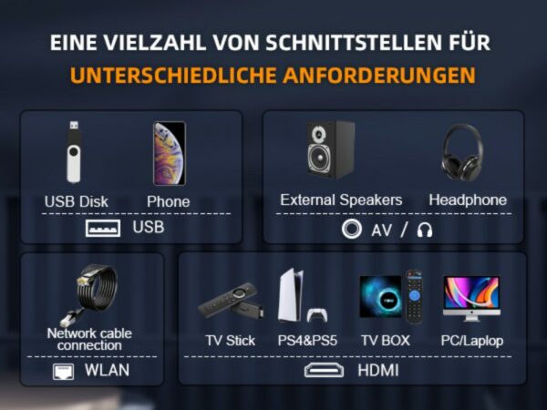 Ein weiteres Highlight ist die 300-Zoll-Großbild-Erfahrung und die digitale Keystone-Korrektur, die es ermöglicht, auch bei seitlicher Aufstellung des Projektors ein perfekt ausgerichtetes Bild zu erhalten. Die Vielseitigkeit des XGODY X1 zeigt sich auch in seinen zahlreichen Anschlussmöglichkeiten, darunter HDMI, USB und Bluetooth, sodass Sie eine Vielzahl von Geräten problemlos anschließen können.