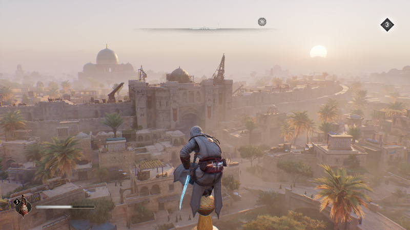 Ganz zu Anfang möchte ich schon mal einen Punkt hervorheben, der mir persönlich am meisten an Mirage gefällt. Nach den letzten Teilen der Assassin’s Creed Games geht Mirage mehr in Richtung der älteren Teile vor Valhalla, Odyssey und Origins. Denn generell rudert Mirage entgegen der typischen Nachfolger Entwicklungen, die oft in Größe und Länge seine Vorgänger übertreffen, in dem die Spielzeit mit 20-30 Stunden zu Buche fällt. Dabei fokussiert sich das Geschehen vor allem auf die Stadt Bagdad und das nahe Umfeld und verzichtet auf utopisch weite Wege und Schauplätze, die man nur durch die Schnellreise erreichen kann (ja, auch Mirage hat Schnellreisepunkte, diese sind aber nicht unbedingt erforderlich).