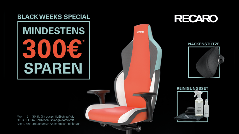 Bei RECARO Gaming sind Themen wie Ergonomie, Performance, Langlebigkeit, Sicherheit und Nachhaltigkeit Kernpunkte bei ihren Produkten – sowohl bei den Sitzen als auch beim Zubehör. Aus diesem Grund freut sich RECARO Gaming bekannt geben zu können, dass sich die diesjährige Black Friday Aktion rundum die Produktreihe des RECARO Rae drehen wird. Bei der Black Friday Aktion vom 15. bis 30. November bietet der Premium-Sitzhersteller den Kunden einen Discount von bis zu 300,00 Euro. Mit in der Rabattaktion enthalten sind unter anderem ein spezielles Reinigungsset sowie eine Rae Nackenstütze, wodurch der Komfort der Stühle noch einmal gesteigert wird.