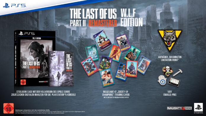 Vorbestellungen sind ab dem 5. Dezember möglich, sowohl für die Standard-Edition als auch für die The Last of Us Part II Remastered W.L.F. Edition, die in ausgewählten Märkten (USA, Großbritannien, Deutschland, Frankreich, Benelux, Italien, Spanien, Portugal und Österreich) exklusiv auf direct.playstation.com erhältlich sein wird. Die W.L.F Edition enthält ein SteelBook, vier Emaille-Pins, einen Washington Liberation Front-Aufnäher und insgesamt 47 Society of Champions-Sammelkarten, darunter acht holografische Karten. Diese konnten von den Spielern in Part II gesammelt werden und sind erstmals physisch erhältlich.