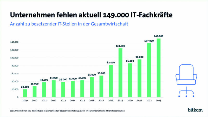 Der Mangel an IT-Fachkräften verschärft sich weiter. In den deutschen Unternehmen sind aktuell 149.000 Stellen für IT-Expertinnen und -Experten unbesetzt. Das sind noch einmal 12.000 mehr als vor einem Jahr, als 137.000 Stellen offen waren. Das sind Ergebnisse der neuen Bitkom-Studie zum Arbeitsmarkt für IT-Fachkräfte, für die 853 Unternehmen aller Branchen repräsentativ befragt wurden. Nur während der Corona-Pandemie 2020 und 2021 wurde der kontinuierliche Anstieg der vergangenen Jahre unterbrochen, und die Zahl offener Stellen fiel kurzzeitig unter die Marke von 100.000. „Der Mangel an IT-Fachkräften besteht in Deutschland unabhängig von Konjunkturzyklen und ist ein systemisches Problem der deutschen Wirtschaft. Zu wenig Fachkräfte und zu viel Regulierung bremsen das digitale Deutschland“, sagt Bitkom-Präsident Dr. Ralf Wintergerst. „Davon ist neben den Unternehmen zunehmend auch die öffentliche Verwaltung betroffen, die unbedingt mehr Digitalkompetenz braucht. Der Mangel an IT-Fachkräften wird sich durch die demografische Entwicklung in den kommenden Jahren weiter verschärfen. Politik und Unternehmen müssen schnell und massiv gegensteuern.“