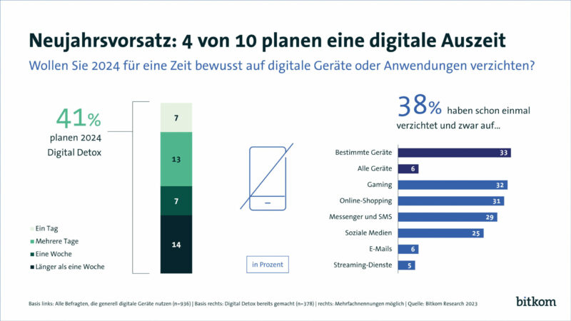Hinweis zur Methodik: Grundlage der Angaben ist eine Umfrage, die Bitkom Research im Auftrag des Digitalverband Bitkom durchgeführt hat. Dazu wurden 1.006 Personen in Deutschland ab 16 Jahren telefonisch befragt. Die Befragung fand im Zeitraum von KW 45 bis KW 47 2023 statt. Die Gesamtumfrage ist repräsentativ. Die Fragestellungen lauteten: „Haben Sie sich für das kommende Jahr 2024 vorgenommen, für eine bestimmte Zeit bewusst auf digitale Geräte oder Anwendungen zu verzichten? Damit meinen wir, dass für mindestens einen Tag auf bestimmte Geräte verzichtet wird. Falls ja, wie lange wollen Sie insgesamt verzichten?“ sowie „Haben Sie schon einmal bewusst auf digitale Geräte wie Smartphone, Tablet oder Spielkonsole bzw. bestimmte Anwendungen wie soziale Netzwerke oder Games verzichtet, so genanntes ‚Digital Detox‘? Falls ja, wie lang war die längste Phase Ihres durchgehenden Verzichts in Tagen?“ und „Auf welche der folgenden Bereiche haben Sie schon einmal im Privatleben für eine gewisse Zeit bewusst verzichtet? Die Nutzung digitaler Medien und Geräte für berufliche Zwecke ist nicht gemeint.