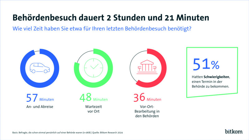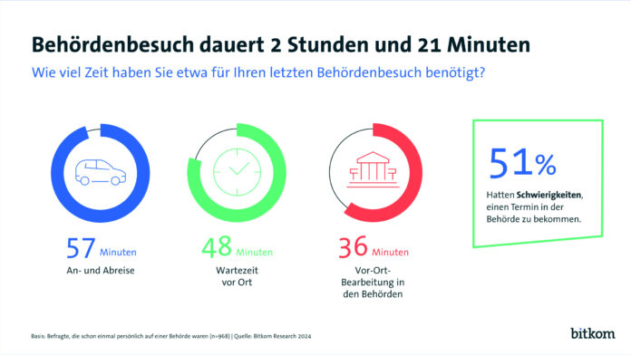 Hinweis zur Methodik: Grundlage der Angaben ist eine Umfrage, die Bitkom Research im Auftrag des Digitalverband Bitkom durchgeführt hat. Dabei wurden 1.007 Personen in Deutschland ab 18 Jahren telefonisch befragt, darunter 968 Personen, die schon persönlich bei einer Behörde waren. Die Befragung fand im Zeitraum von KW 36 bis KW 38 2023 statt. Die Gesamtumfrage ist repräsentativ. Die Fragestellungen lauteten: „Wie viel Zeit haben Sie etwa für die An- und Abreise Ihres letzten Behördengangs aufgewendet?“; „Wie lange haben Sie etwa vor Ort in der Behörde gewartet?“; „Wie lange hat die Vorort-Bearbeitung in der Behörde etwa gedauert?“; „Denken Sie an Ihren letzten Behördengang wie Ummeldung, KFZ-Anmeldung oder eine Ausweisbeantragung. Hatten Sie Schwierigkeiten für diesen Behördengang einen Termin zu bekommen?