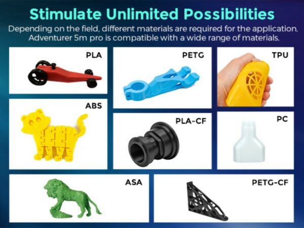 Der Adventurer 5M Pro ist übrigens für eine Vielzahl an Materialien gemacht, nämlich PLA, PETG, TPU, ABS, ASA. PLA-CF und PETG-CF. Es bleiben also keine Wünsche offen. Daneben hat er noch eine Menge weiterer Features, die seine Bedienung komfortabel und einfach machen. In der Pro-Version besitzt er z. B. ein Remote Camera Monitoring und ein automatisches Abschalten. Sollten Stromausfälle keine Seltenheit sein, muss man sich keine Sorgen machen. Ein interner Stromspeicher fängt Unterbrechungen in der Zufuhr ab, damit während eines Prozesses alles so weitergehen kann wie zuvor.