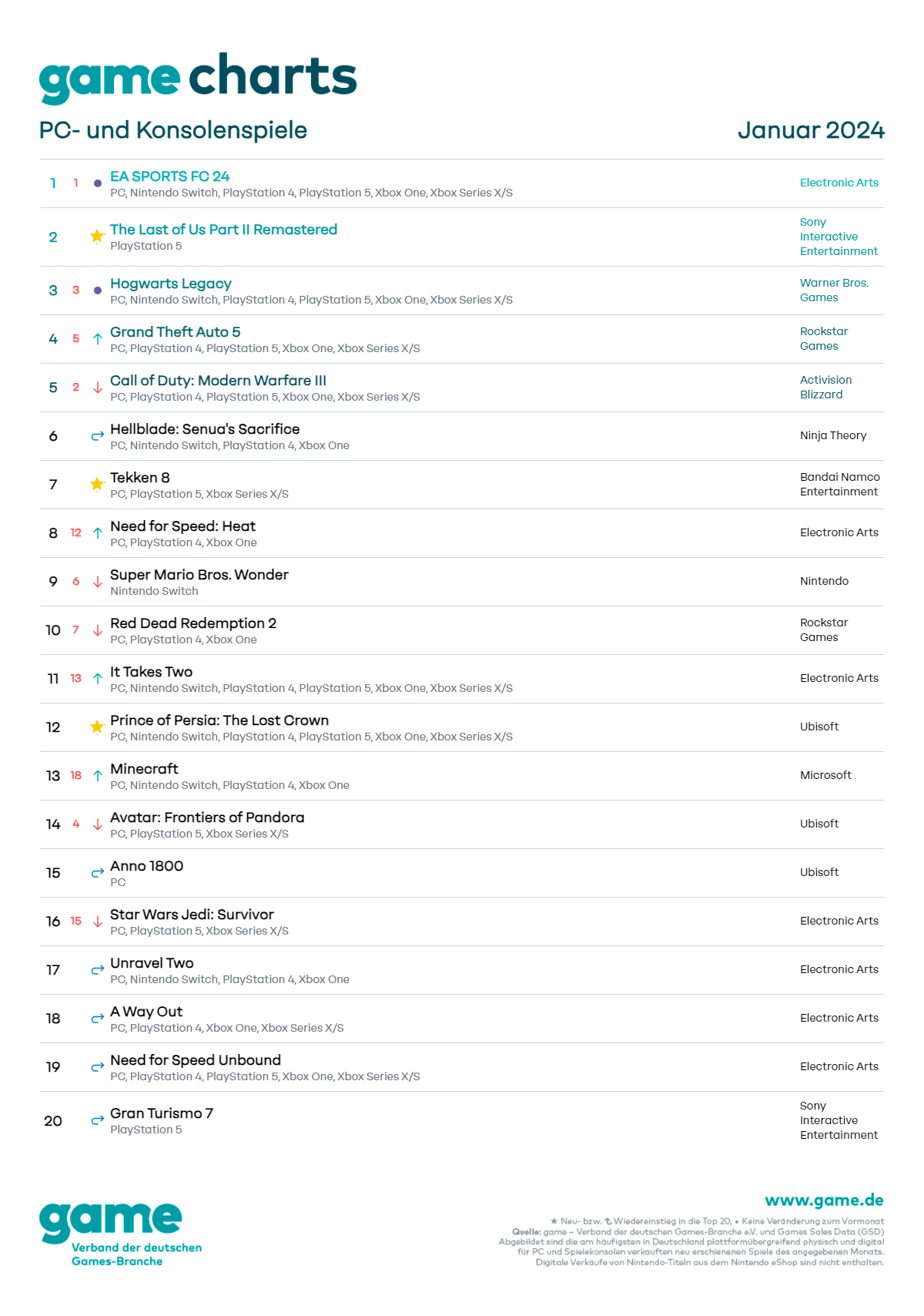Drei neu erschienene Titel für PC und Spielkonsole schaffen es im Januar in die offiziellen game Charts: Direkt auf Platz 2 landet das Action-Abenteuer-Spiel „The Last Of Us Part II Remastered“ (Sony Interactive Entertainment), das für die Spielerfahrung auf der PlayStation 5 optimiert wurde. Neu in den Charts ist auch das Kampfspiel „Tekken 8“ (Bandai Namco Entertainment), das Ende Januar als Fortsetzung der gleichnamigen Spielereihe erschien und direkt auf Platz 7 einsteigt. Eine weitere Neuerscheinung in den Charts: das Action-Adventure voller persischer Mythen und Schwertkämpfe „Prince of Persia: The Lost Crown“ (Ubisoft) auf dem zwölften Platz. Die Charts führt im Januar der Vormonatserste, die Fußballsimulation „EA SPORTS FC 24“ (Electronic Arts), an.