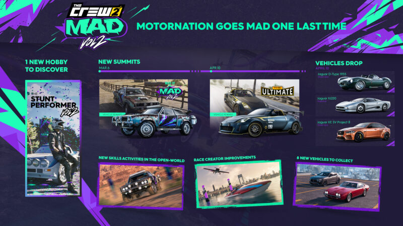 Ubisoft gab heute bekannt, dass mit Mad Vol. 2 nach sechs Jahren das letzte Content-Update für The Crew 2 erscheint. Dieses Update stellt einen Meilenstein für The Crew 2 dar und führt die optimierte Inhaltsrotation für grenzenlose Spieler-kreierte Inhalte da.