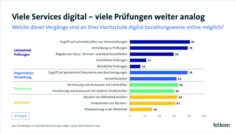 Trotz Online-Angeboten für Vorlesungen, Seminare und Co. – Prüfungen laufen an den Hochschulen zum größten Teil weiter analog ab: Schriftliche Prüfungen können nur 22 Prozent online ablegen, mündliche Prüfungen 14 Prozent. Viele Services lassen sich an Hochschulen hingegen digital in Anspruch nehmen: 81 Prozent der Studierenden haben online Zugriff auf Lehrmaterialien aus Veranstaltungen, 78 Prozent haben Zugriff auf persönliche Dokumente wie Bescheinigungen. Ebenfalls 78 Prozent können sich online zu Prüfungen anmelden, 63 Prozent können sich online immatrikulieren. Wintergerst: „Digitale Lösungen können insbesondere in der Verwaltung entlasten und helfen, gerade auch an großen Universitäten mit einer Vielzahl von Studierenden administrative Prozesse für beide Seiten effizient und komfortabel zu gestalten. Was die digitale Transformation angeht, können die deutschen Hochschulen Vorbilder für Schulen und Behörden sein.“