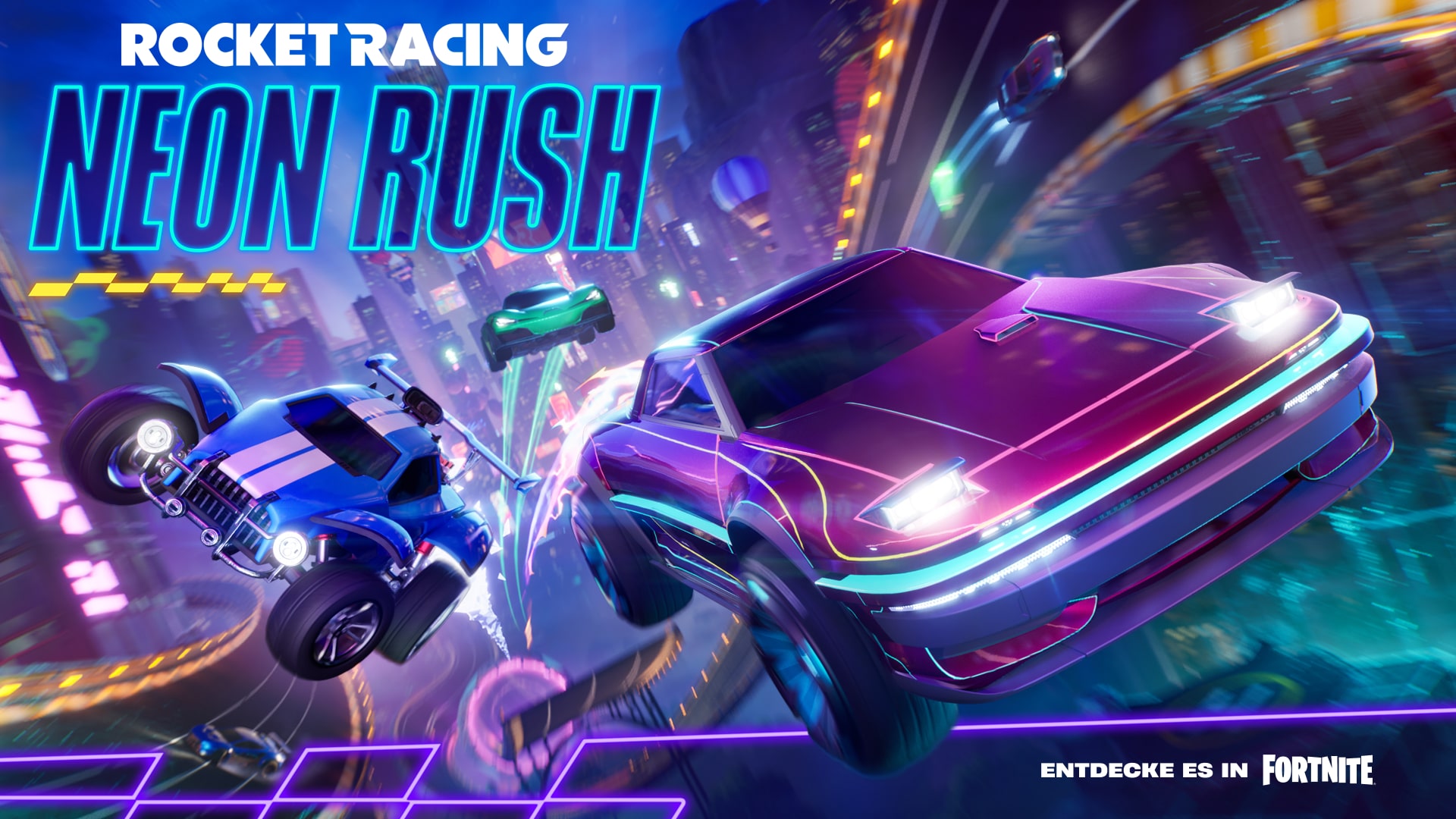 Stürzt euch in Rocket Racing in nächtliche Action auf neonleuchtenden Strecken mitten durch die Stadt. Mit Neon Rush erleben Creator-Strecken jetzt ihren vollen Auftritt – in Rennen und Zeitfahren-Wettkämpfen!