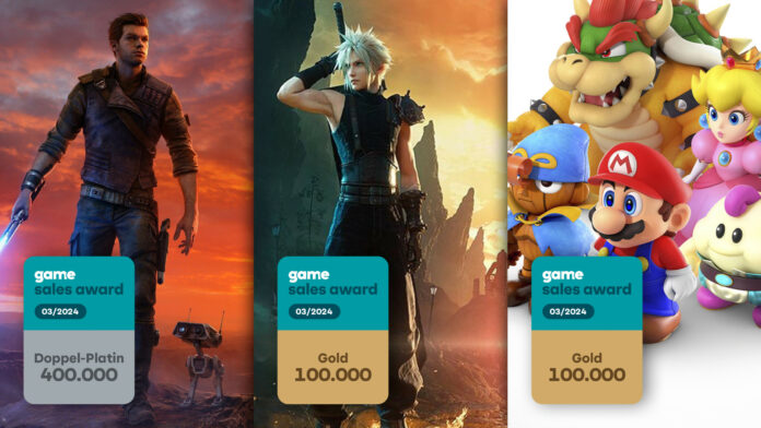 Für März werden insgesamt drei Titel mit dem game Sales Award des game – Verband der deutschen Games-Branche ausgezeichnet: Das Action-Abenteuer-Spiel „Star Wars Jedi: Survivor“ konnte sich über 400.000-mal in Deutschland verkaufen und bekommt einen Doppel-Platin-Award. In der Fortsetzung der „Star Wars Jedi“-Spielereihe begibt sich Jedi-Ritter Cal erneuet auf ein actionreiches, galaktisches Abenteuer. Das Action-Rollenspiel „Final Fantasy VII Rebirth“ hat die Marke von 100.000 verkauften Exemplaren geknackt und wird mit einem Gold-Award ausgezeichnet. Der Titel setzt die Geschichte des „Final Fantasy VII Remake“-Protagonisten Cloud und seiner Freunde fort und bietet Spielenden eine Reise durch eine faszinierende Welt voller Abenteuer. Eine Trophäe in Gold bekommt auch das Rollenspiel „Super Mario RPG“. In dem allerersten Mario-Rollenspiel, neu in Szene gesetzt für Nintendo Switch, begleiten die Spielerinnen und Spieler eine Heldengruppe rund um Super Mario auf ihrer abenteuerlichen Reise.