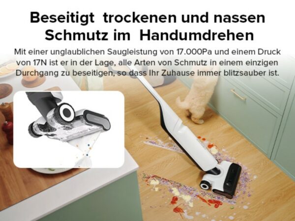 Aufgrund seiner enormen Saugleistung von 17.000 Pa sorgt der roborock Flexi Pro für eine beeindruckende Reinigungskraft. Kein Schmutzpartikel ist zu klein, kein Krümel zu groß – dieser Sauger bewältigt alles. Das FlatReach-Design ermöglicht es, mühelos unter Möbeln und in enge Räume zu gelangen. Dadurch werden auch die schwer zugänglichen Stellen im Haus gründlich gereinigt.