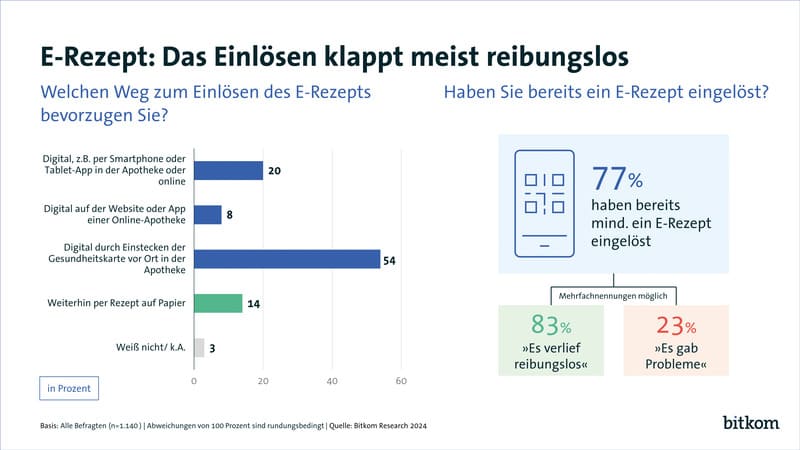 77 Prozent der Deutschen geben an, bereits ein oder mehrere E-Rezepte eingelöst zu haben. Bei 83 Prozent verlief das Procedere reibungslos, 23 Prozent berichten von Problemen – einige haben also beim Einlösen von E-Rezepten mal gute, mal schlechte Erfahrungen gemacht. „Die Umstellung auf das E-Rezept betrifft nicht nur Patientinnen und Patienten sowie die Apotheken, sondern auch die Ärztinnen und Ärzte. Die Einführung neuer Prozesse – dazu zählt auch die unmittelbare Signatur und Freigabe der digitalen Rezepte in den Praxen – ist mittlerweile aber auf einem sehr guten Weg“, betont Bitkom-Vizepräsidentin Raab.