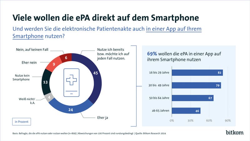 Herzstück des digitalen Gesundheitssystems soll die elektronische Patientenakte werden, kurz ePA. In ihr werden unter anderem medizinische Daten, Befunde und Untersuchungsergebnisse gespeichert, so dass diese für den bzw. die jeweils betroffene Patientin bzw. Patienten jederzeit einsehbar sind und auf Wunsch auch mit den behandelnden Ärztinnen und Ärzten geteilt werden können. Zwar gibt es die ePA bereits seit Januar 2021, der Durchbruch bei der tatsächlichen Nutzung wird allerdings erst für 2025 erwartet. Ab dann gilt das politisch bereits beschlossene sogenannte „Opt-out“. Heißt: Alle Versicherten erhalten automatisch eine elektronische Patientenakte – es sei denn, sie widersprechen aktiv. Nach Angaben der Kassenärztlichen Bundesvereinigung (KBV) nutzt aktuell rund 1 Prozent der Versicherten eine elektronische Patientenakte. 71 Prozent wollen dies laut Bitkom-Studie künftig tun. Jeder bzw. jede vierte (26 Prozent) schließt die Nutzung eher (18 Prozent) bzw. in jedem Fall (8 Prozent) aus. Vor einem Jahr belief sich der Wert der Personen, die die ePA ablehnen, noch auf 37 Prozent. Der Zuspruch für die ePA ist innerhalb eines Jahres deutlich gestiegen. Ein Großteil der Menschen, die die elektronische Patientenakte nutzen oder dies tun wollen, wollen sie dann auch in einer App auf ihrem Smartphone verwalten und einsehen. Dies trifft auf 69 Prozent aus dieser Gruppe zu. Raab: „Mit der elektronischen Patientenakte erhalten die Versicherten einen schnellen Zugriff auf ihre medizinischen Daten, ihre Diagnosen und auch Dokumente wie Impf- oder Mutterpass. Sie werden dadurch als Patientinnen und Patienten souveräner und mündiger.“