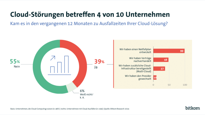 Hinweis zur Methodik: Grundlage der Angaben ist eine Umfrage, die Bitkom Research im Auftrag des Digitalverband Bitkom durchgeführt hat. Dabei wurden 603 Unternehmen ab 20 Beschäftigten in Deutschland telefonisch befragt. Die Befragung fand im Zeitraum von KW 12 bis KW 19 2024 statt. Die Umfrage ist repräsentativ für die Gesamtwirtschaft. Die Fragestellung lautete: „Kam es in den vergangenen 12 Monaten in Ihrem Unternehmen zu Ausfallzeiten Ihrer Cloud-Lösungen? Und wenn ja, wie haben Sie auf die Ausfälle Ihres Cloud-Providers im Nachhinein reagiert?