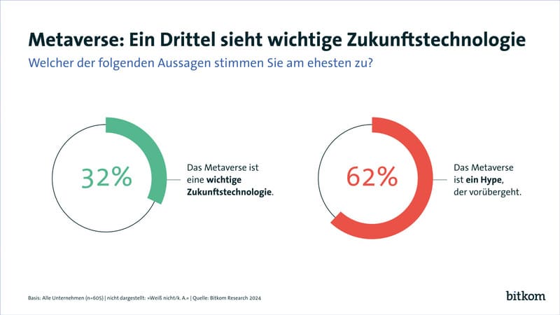 „Auch wenn sich der Anteil jener Unternehmen, die sich bereits mit dem Metaverse beschäftigt haben, in den letzten beiden Jahren von 6 auf 13 Prozent mehr als verdoppelt hat: Das Metaverse wird weiterhin massiv unterschätzt“, sagt Bitkom-Hauptgeschäftsführer Dr. Bernhard Rohleder. „Wer das Metaverse für eine wichtige Zukunftstechnologie hält, sollte sich mit den Möglichkeiten für das eigene Unternehmen ernsthaft auseinandersetzen.“