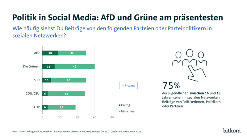 Nahezu alle (98 Prozent) der 16- bis 18-Jährigen in Deutschland nutzen zumindest ab und zu soziale Netzwerke wie YouTube, Instagram, Snapchat oder TikTok – und die meisten von ihnen treffen dort auch auf die Politik. 75 Prozent sehen in den sozialen Netzwerken Beiträge von Parteien, einzelnen Parteipolitikerinnen oder -politikern. Besonders sichtbar sind demnach die Grünen und die AfD: 60 Prozent der 16- bis 18-jährigen Social-Media-Nutzerinnen und -Nutzer geben an, Beiträge der Grünen zu sehen, darunter 14 Prozent häufig. Es folgt die AfD, deren Beiträge von insgesamt der Hälfte (50 Prozent) gesehen werden, darunter 18 Prozent sogar häufig. Das sind Ergebnisse einer repräsentativen Studie im Auftrag des Digitalverbands Bitkom, für die mehr als 900 Kinder und Jugendliche in Deutschland befragt wurden. Bei Landtagswahlen darf in einigen Bundesländern bereits ab 16 Jahren gewählt werden, so auch am 22. September in Brandenburg.