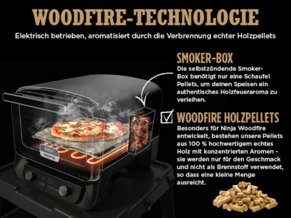 Mit nur einer Schaufel Woodfire-Pellets, die im Lieferumfang enthalten sind, kann man Gerichten das unverwechselbare Aroma eines Holzfeuers verleihen – und das bei Temperaturen von bis zu 370 °C. Die Pellets bestehen aus 100 % natürlichem Holz und sind speziell darauf ausgelegt, maximale Rauchentwicklung bei minimalem Verbrauch zu bieten. Der Ofen nutzt die Pellets nicht als Brennstoff, sondern ausschließlich, um den Gerichten das Aroma zu geben. Damit ist er nicht nur effizient, sondern auch umweltfreundlicher als viele traditionelle Smoker.