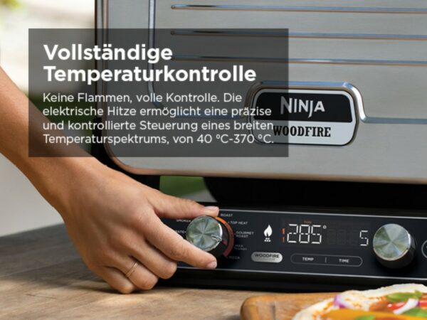 Mit einem breiten Temperaturbereich von 40°C bis hin zu beeindruckenden 370°C überzeugt der Ninja Woodfire. Diese Vielfalt an Einstellungsmöglichkeiten ermöglicht es, eine breite Palette von Gerichten präzise zuzubereiten – von langsam gegartem, zartem Fleisch bis hin zu schnell gebackenen Pizzen, die wie aus dem Steinofen schmecken. Besonders die Höchsttemperatur von 370°C ist ein Alleinstellungsmerkmal, das es erlaubt, knusprige und gleichzeitig saftige Ergebnisse zu erzielen, sei es bei Steaks oder Aufläufen.