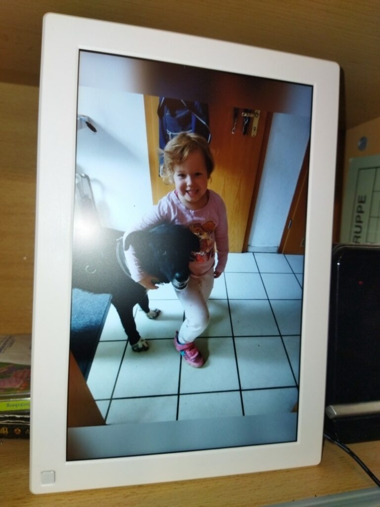 Gesagt, getan, Kabel mit passendem Stecker gekoppelt, Stütze angeschraubt und eingeschaltet. Apropos Stütze, der MyFirst Frame Live kann auch ohne Stütze an die Wand gehängt werden, dafür sind auf der Rückseite zwei Löcher, um ihn sowohl im Hoch- als auch im Querformat aufzuhängen. Jetzt führt uns die Software Schritt für Schritt durch die Einrichtung, die teilweise auch am Handy mit der Kontoerstellung der MyFirst Circle App erfolgt. Sobald der Rahmen dann auch mit der App und den entsprechenden Nutzern gekoppelt ist, kann das Teilen von Bildern beginnen.