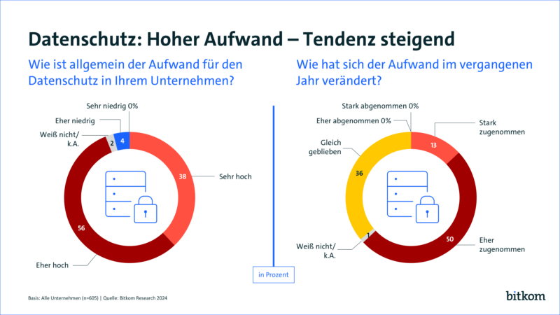 Die europäische Datenschutz-Grundverordnung (DS-GVO) sorgt auch nach sechs Jahren in den Unternehmen für Unzufriedenheit. Inzwischen haben 7 von 10 Unternehmen die DS-GVO vollständig (23 Prozent) oder größtenteils (48 Prozent) umgesetzt, weitere 28 Prozent zumindest teilweise. Allerdings führt sie in den Unternehmen weiterhin zu steigendem Datenschutz-Aufwand. 42 Prozent der Unternehmen haben seit der Einführung mehr Aufwand und gehen davon aus, dass er weiter steigen wird, vor einem Jahr waren es nur 33 Prozent. Weitere 42 Prozent haben seit der Einführung mehr Aufwand und rechnen damit, dass dieser unverändert bleibt (2023: 50 Prozent). Gerade einmal bei 15 Prozent nimmt der zusätzliche Aufwand zusehends ab (2023: 12 Prozent), nur 1 Prozent hat gar keinen gestiegenen Aufwand registriert.