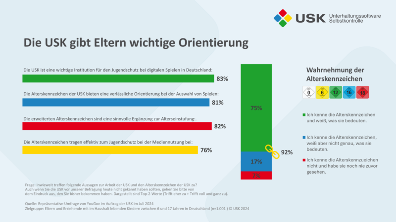 Sowohl der Jugendschutz bei Games als auch eine einheitliche Alterskennzeichnung sind Eltern sehr wichtig. Dabei vertrauen sie der Arbeit der USK. Jeweils über 80 Prozent der Eltern und Erziehenden geben an, dass die USK eine wichtige Institution ist und die Alterskennzeichen der USK sowie die erweiterten Alterskennzeichen durch zusätzliche Hinweise eine wichtige Unterstützung bei der Auswahl von digitalen Spielen bieten. Noch höher liegen diese Werte bei Eltern von Kindern, die mehrmals in der Woche spielen. Dabei kennen drei Viertel der Eltern auch die Bedeutungen der verschiedenen USK-Kennzeichen. Häufigster Berührungspunkt ist in 74 Prozent der Fälle die Spieleverpackung, gefolgt von Spieleplattformen im Netz (56 Prozent). Auch die allgemeine Wahrnehmung der Kennzeichnungen fällt positiv aus: 86 Prozent halten sie für wichtig, jeweils 84 Prozent für hilfreich, notwendig und verständlich.