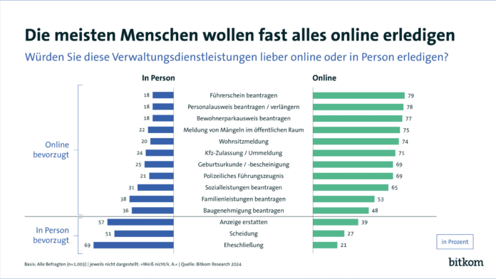 In der Bevölkerung ist der Wunsch, für Verwaltungsangelegenheiten nicht mehr persönlich auf einer Behörde erscheinen zu müssen, weit verbreitet. So wünschen sich 79 Prozent, den Führerschein online beantragen zu können, nur 18 Prozent würden dazu lieber persönlich erscheinen. Beim Personalausweis sind es 78 Prozent, die den Online-Kontakt bevorzugen würden, 18 Prozent das persönliche Erscheinen. Bei vielen anderen Verwaltungsleistungen zeigt sich ein ähnliches Bild, etwa bei der Beantragung des Anwohnerparkausweises (77 Prozent zu 18 Prozent), der Meldung von Mängeln im öffentlichen Raum (75 Prozent zu 22 Prozent), der Wohnsitzanmeldung (74 Prozent zu 20 Prozent) oder der Kfz-Zulassung (71 Prozent zu 24 Prozent). Auch das Ausstellen von Bescheinigungen wie der Geburtsurkunde (69 Prozent zu 25 Prozent) oder eines polizeilichen Führungszeugnisses (69 Prozent zu 21 Prozent) würde überwiegend online nachgefragt. Ebenso überwiegt bei der Beantragung von Sozialleistungen (65 Prozent zu 31 Prozent) und Familienleistungen (53 Prozent zu 38 Prozent) der Online-Wunsch deutlich. Knapper ist es bei der Beantragung von Baugenehmigungen (48 Prozent zu 36 Prozent).