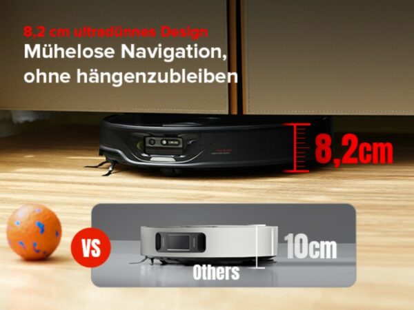 Mit einer Höhe von nur 8,2 cm zeichnet sich der Roborock Qrevo Slim durch sein besonders schlankes Design aus, das ihn ideal für die Reinigung unter niedrigen Möbeln macht. Diese kompakte Bauweise ermöglicht es ihm, schwer zugängliche Bereiche wie unter Betten, Sofas oder Schränken mühelos zu erreichen.