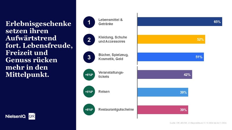 Die beliebtesten Geschenke bleiben Lebensmittel und Getränke (65 Prozent), gefolgt von Kleidung, Schuhen und Accessoires (52 Prozent). Bücher, Spielzeug, Kosmetik sowie Geldgeschenke/Bargeld teilen sich mit jeweils 51 Prozent den dritten Platz. Erlebnisgeschenke setzen ihren Aufwärtstrend fort: So steigt der Anteil derjenigen, die Restaurantgutscheine verschenken möchten von 31 auf 39 Prozent. Auch Gutscheine für Kosmetik- und Fitnessstudios und Wellnesseinrichtungen (vom 30 auf 37 Prozent) sowie Tickets für Veranstaltungen (von 36 auf 42 Prozent) und Reisen (von 34 auf 39 Prozent) gewinnen an Beliebtheit. „Für 37 Prozent der Deutschen sind Erlebnisse wichtiger als materielle Besitztümer“, sagt Petra Süptitz, Konsumexpertin bei NielsenIQ/GfK. „Das verdeutlicht den Wunsch, die Krisenjahre hinter sich zu lassen und Lebensfreude, Freizeit und Genuss stärker in den Mittelpunkt zu rücken.“