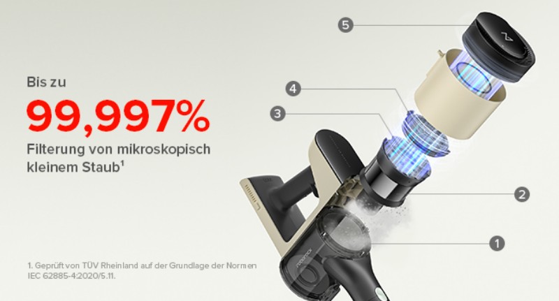 Neben dem HEPA-Filter besteht das System aus einem weiteren Schaum- und Edelstahlfilter, die dafür sorgen, dass der Luftstrom während des Saugens optimiert bleibt und die Filter effektiv arbeiten. Diese Technologie verhindert, dass der Staubsauger nach längerem Gebrauch an Saugleistung verliert, und sorgt dafür, dass der Luftstrom gleichmäßig bleibt.