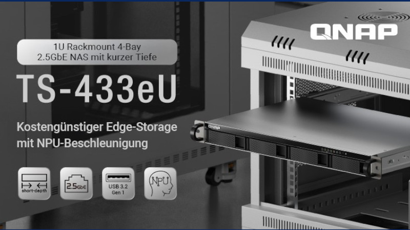 QNAP Systems, Inc., ein führender Innovator von Computer- und Speicherlösungen, stellte heute das kompakte 1U Rackmount 4-Bay NAS TS-433eU vor, das kleinen und mittelständischen Unternehmen und Organisationen eine erschwingliche Edge Speicher- und Sicherungslösung bietet. Mit seinem schlanken 1U Design und einer Tiefe von nur 11,51 Zoll (292,3 mm) passt das TS-433eU problemlos in Umgebungen mit begrenztem Platzangebot.
