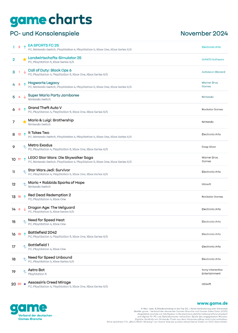 Den ersten Platz der meistverkauften PC- und Konsolenspiele in Deutschland konnte „EA SPORTS FC 25“ (Electronic Arts) zurückgewinnen, nachdem es im Vormonat auf Platz 2 gelandet war. Diesen nimmt im November der „Landwirtschafts-Simulator 25“ (GIANTS Software) ein, der höchste Neueinsteiger in diesem Monat. Auf Platz 3 folgt mit „Call of Duty: Black Ops 6“ (Activision Blizzard) der Vormonatserste. Ebenfalls ganz neu in den Charts ist „Mario & Luigi: Brothership“ (Nintendo) auf Platz