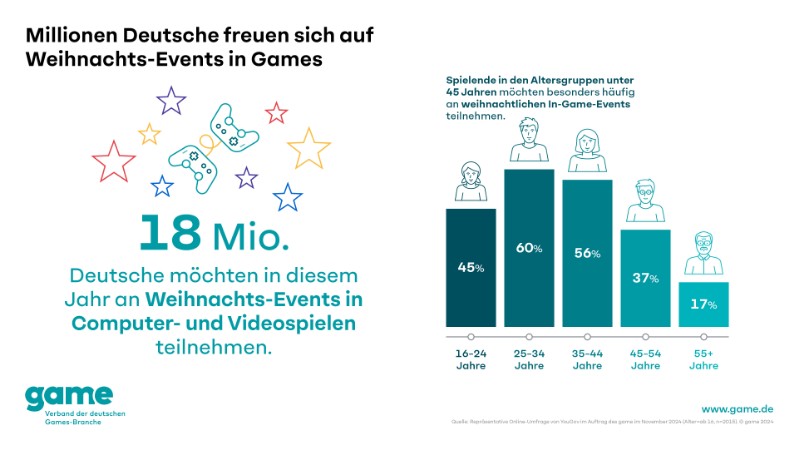 Spielewelten voller Weihnachtslichter und Schneeflocken, Weihnachtsmann-Skin statt Soldatensrüstung oder virtuelle Schneeballschlachten statt Schwertkämpfe: Besondere Weihnachts-Events in Computer- und Videospielen vereinen auf unterhaltsame Weise den Zauber der Feiertage mit dem liebsten Hobby. So möchte in diesem Jahr mehr als jede beziehungsweise jeder dritte Spielende ab 16 Jahren in Deutschland (38 Prozent) an Weihnachts-Events in Games teilnehmen. Das entspricht rund 18 Millionen Menschen. Das zeigen die Ergebnisse einer repräsentativen Umfrage des game – Verband der deutschen Games-Branche in Zusammenarbeit mit dem Marktforschungsunternehmen YouGov.