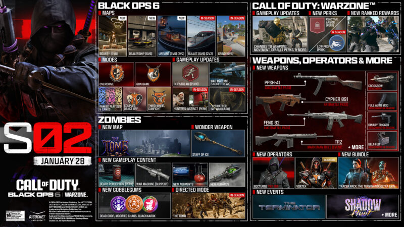 Fünf neue Karten erwarten Euch, darunter das luxuriöse Penthouse eines Gangsterbosses, ein Autohaus und eine Yacht. Später in der Season folgen die rasante Karte „Bullet Strike“ und das Comeback der beliebten Map „Grind“ aus Black Ops II. Neben neuen Modi wie „Overdrive“ und „Gun Game“ sorgen die Valentinstags-LTMs „Third Wheel Gunfight“ und „Couples Dance Off“ für actionreiche Abwechslung. Erweitert Euer Arsenal mit dem Perk „Slipstream“, die Abschusserie „War Machine“ und weiteren taktischen Möglichkeiten. Zusätzlich startet die neue Season des Ranglistenspiels mit exklusiven Belohnungen. Details zu Major I der Call of Duty League folgen in Kürze.