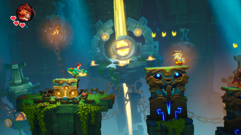 Nikoderiko kann alleine oder zu zweit gespielt werden und ein zweiter Spieler als Luna mitspielen kann. Der Fokus konzentriert sich dabei immer auf einen der Spieler, so dass der andere nicht aus dem Bild laufen darf und leider ein Leben verliert sollte man nicht schnell genug zurück kommen. Bei über Coop Session ist uns dann ein kleiner Bug aufgefallen, wenn beim Auswahl des Reittier der fokussierte weiter geht, steckt der andere unwiderruflich im Auswahlmodus fest und muss leider geopfert werden um zurück zu kommen. Aber selbst das ist relativ gut gelöst, denn sobald ein Spieler KO geht, kommt er in einer steuerbaren Blase zurück und kann durch den verbleibenden Spieler zurückgeholt werden damit es weiter gehen kann.