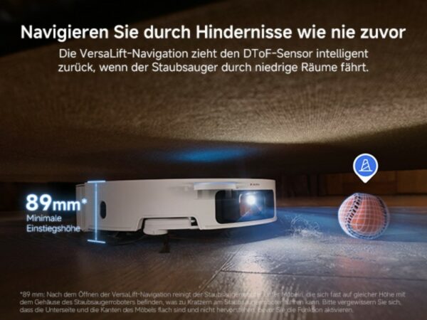 Positiv überrascht hat uns auch das Hindernismanagement des Dreame X50 Ultra Complete. Die VersaLift-Navigation ist ein ausgeklügeltes System, das den Roboter dazu befähigt, auch schwer zugängliche Stellen wie unter Sofas oder niedrigen Regalen gründlich zu reinigen. Besonders beeindruckend ist, dass der Laserturm eingefahren wird, um selbst unter niedrigen Möbeln problemlos zu navigieren – ohne dabei die Präzision der Reinigung zu beeinträchtigen.