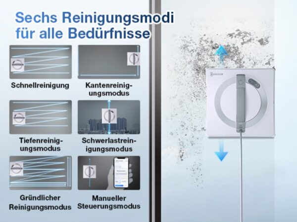 Neben sieben voreingestellten Reinigungsmodi, darunter Schnell-, Tiefen- und Kantenreinigung, bietet die App eine optimale Anpassung des Roboters an die jeweiligen Bedürfnisse. Die intuitive Benutzeroberfläche macht die Bedienung besonders einfach – auch für Technikneulinge ein klarer Pluspunkt. So wird die Fensterreinigung nahezu zum Kinderspiel.