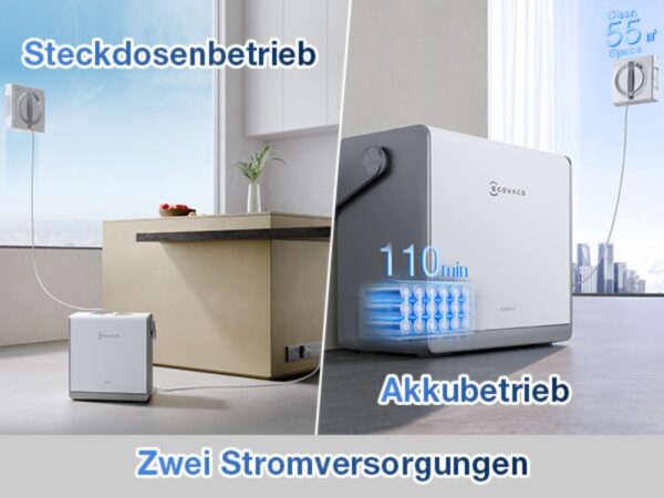 Ausgestattet mit einem leistungsstarken Lithium-Akku ermöglicht der ECOVACS WINBOT W2 PRO OMNI beeindruckende 110 Minuten Betriebszeit. Dies ist besonders vorteilhaft in Bereichen, in denen keine Steckdose in unmittelbarer Nähe ist, wie zum Beispiel auf Balkonen oder in Badezimmern. Eine vollständige Akkuladung reicht aus, um eine Fensterfläche von bis zu 55 m² zu reinigen – das entspricht in etwa der Glasfläche eines großen Wintergartens.
