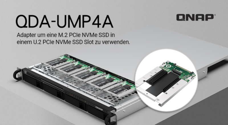 QNAP Systems, Inc., ein führender Innovator von Computer-, Netzwerk- und Speicherlösungen, hat heute den QDA-UMP4A Adapter offiziell veröffentlicht. Dieser Adapter ermöglicht es Anwendern, eine M.2 PCIe NVMe SSD in einen 2,5-Zoll U.2 (SFF-8639) PCIe NVMe SSD Steckplatz eines QNAP NAS zu installieren.