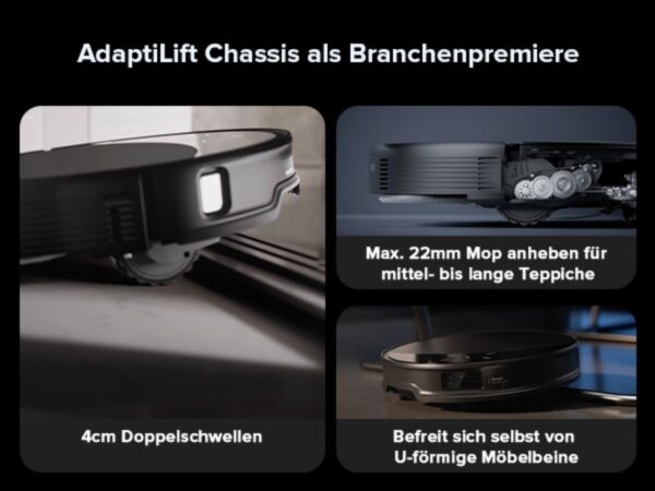 Hindernisse und Türschwellen von bis zu 4 cm Höhe überwindet der Roboter dank des AdaptLift Chassis mühelos. In Wohnungen mit unterschiedlichen Bodenhöhen und Teppichen navigierte der Saros 10R souverän über alle Übergänge hinweg, ohne dabei an Effizienz einzubüßen. Diese Fähigkeit gewährleistet eine nahtlose Reinigung, selbst in Räumen mit erhöhten Schwellen oder dicken Teppichen.