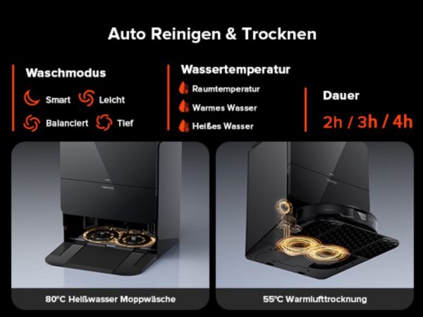 Mit einer Höhe von nur 7,98 cm gelangt der Roborock Saros 10R mühelos unter niedrige Möbel. Die 10-in-1 Multifunktions-Dockingstation 4.0 übernimmt zahlreiche Wartungsaufgaben automatisch, darunter das Abnehmen der Mopps. Zudem verkürzt sie die Ladezeit auf nur 2,5 Stunden, was den Bedienkomfort erhöht.