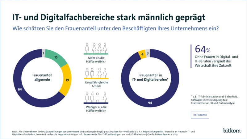 Geht es um den allgemeinen Frauenanteil unter den Beschäftigten deutscher Unternehmen, sind in 64 Prozent der Unternehmen weniger als die Hälfte weiblich. Weitere 19 Prozent haben etwa gleiche Anteile von Frauen und Männern in der Belegschaft. Weitere 15 Prozent mehr Frauen als Männer. In IT- und Digitalberufen innerhalb der Unternehmen, also zum Beispiel in der IT-Administration oder Softwareentwicklung, aber auch in Abteilungen für digitale Transformation oder Künstliche Intelligenz beschäftigt hingegen keines der repräsentativ befragten Unternehmen (0 Prozent) mehr Frauen als Männer. Im Gegenteil: Mit 94 Prozent sind in fast allen deutschen Unternehmen weniger als die Hälfte der IT- und Digitalstellen weiblich besetzt. In weiteren 4 Prozent ist der Geschlechteranteil in diesen Berufen etwa gleich. „Frauen bringen neue Perspektiven und andere Erfahrungen in Unternehmen ein. Diese Vielfalt stärkt nicht nur technologische Innovation und Wettbewerbsfähigkeit. Mehr Frauen für IT- und Digitalberufe zu gewinnen, ist auch eine Frage der Teilhabe und gleichberechtigten Mitgestaltung der Digitalisierung“, so Bitkom-Hauptgeschäftsführer Dr. Bernhard Rohleder.