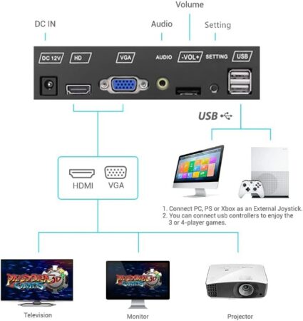 Zahlreiche Anschlussmöglichkeiten machen die Pandorra Box 3D zu einem vielseitigen Begleiter für Retro-Fans. Sie kann problemlos an unterschiedliche Monitore und Fernseher angeschlossen werden. Egal ob über HDMI an moderner Smart-TV oder klassischer Bildschirm – die flexible Kompatibilität sorgt dafür, dass das nostalgische Arcade-Erlebnis auf nahezu jedem Display genossen werden kann.