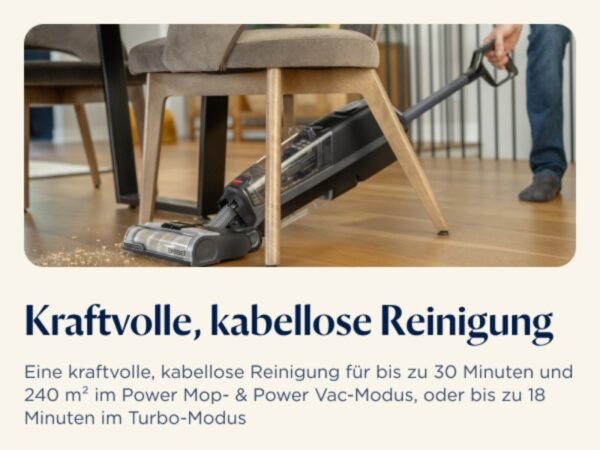 Lästiger Kabelsalat gehört mit dem CrossWave OmniForce Edge Pro der Vergangenheit an. Dank seines leistungsstarken Akkus ermöglicht das Gerät eine kabellose Nutzung von bis zu 30 Minuten – perfekt für die Reinigung größerer Wohnflächen ohne ständiges Umstecken oder Einschränkungen durch ein Kabel. Diese uneingeschränkte Bewegungsfreiheit sorgt für ein müheloses Reinigungserlebnis, insbesondere in weitläufigen oder verwinkelten Räumen.