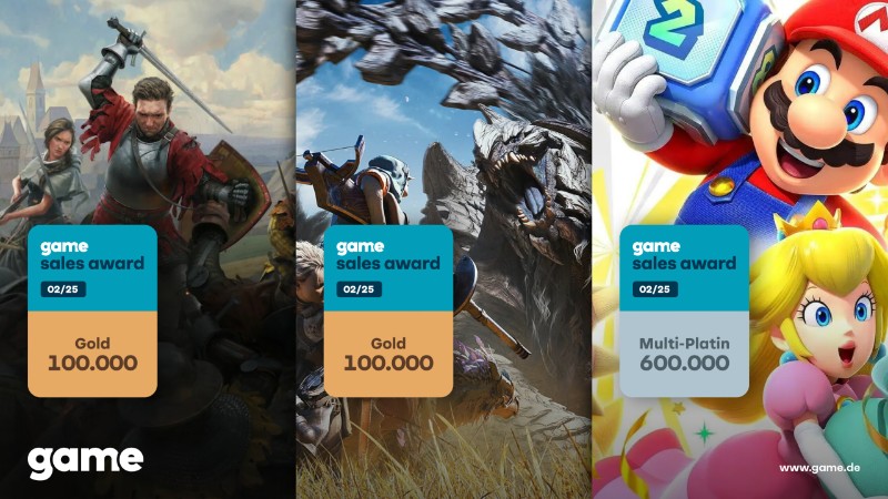Drei Titel bekommen im Februar den game Sales Award des game – Verband der deutschen Games-Branche: „Super Mario Party Jamboree” hat die Marke von 600.000 verkauften Spielen in Deutschland geknackt und kann sich über eine Multi-Platin-Auszeichnung freuen. Im Party-Spiel treten Mario und seine Freunde auf verschiedenen Spielbrettern in unterhaltsamen Wettkämpfen gegeneinander an. Das Mittelalter-Rollenspiel „Kingdom Come: Deliverance II“ wird für über 100.000 verkaufte Exemplare mit dem game Sales Award in Gold ausgezeichnet.