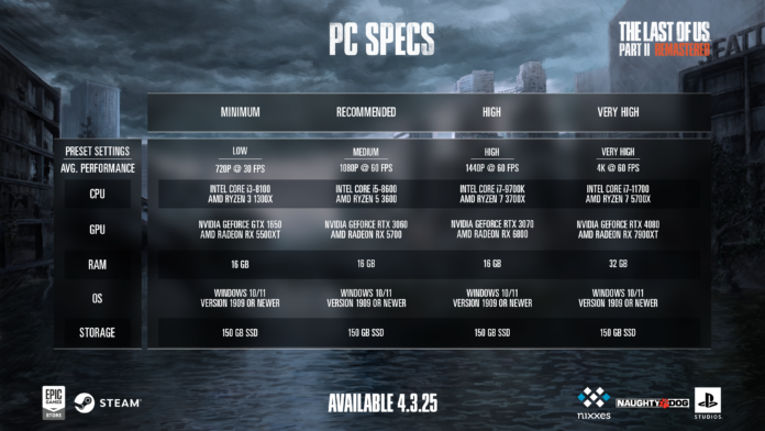 Ab dem 3. April kann Ellies Rachefeldzug in The Last of Us Part II Remastered auch auf dem PC erlebt werden. Das Action-Adventure von Naughty Dog wird auf Steam und im Epic Games Store erhältlich sein. Für die Portierung ist Nixxes Software verantwortlich.