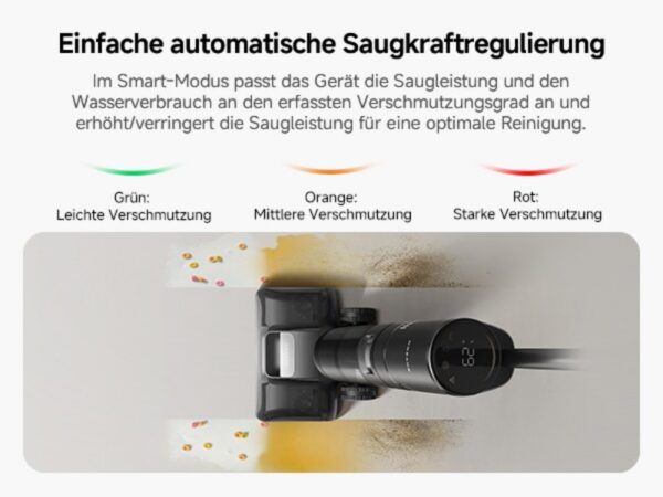 Drei verschiedene Reinigungsmodi sorgen für maximale Flexibilität und ermöglichen eine Reinigung, die genau auf die individuellen Bedürfnisse abgestimmt ist. Der Standardmodus eignet sich perfekt für die tägliche Bodenpflege, da er eine ausgewogene Mischung aus Effizienz und Energieeinsparung bietet. Wer mit hartnäckigen Verschmutzungen zu kämpfen hat, kann auf den Intensivmodus zurückgreifen, der mit maximaler Leistung selbst tiefsitzenden Schmutz entfernt.