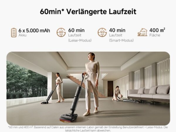 Leistungsstarke Staubsauger bringen nur dann echten Mehrwert, wenn sie auch ausdauernd sind – und genau hier überzeugt der Dreame H15 Pro mit seiner beeindruckenden Akkulaufzeit. Mit sechs 5.000-mAh-Akkus schafft er bis zu 60 Minuten Reinigung im Leise-Modus oder 40 Minuten im Smart-Modus. Damit eignet er sich perfekt für große Flächen, ohne dass zwischendurch aufgeladen werden muss.