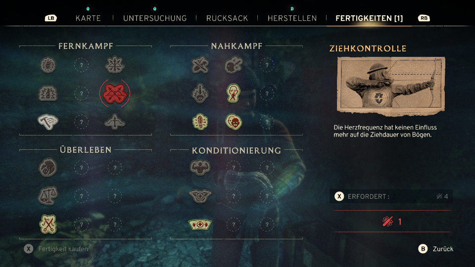 Leveln, Pfff… vergesst es. In Atomfall wird nicht gelevelt, sondern geskillt. Mit keinen Ampullen, die es zu sammeln gilt, lassen sich neue und vor allem bessere Fähigkeiten freischalten. Über das Fähigkeitenmenü könnt ihr die Punkte (Anzahl der gefundenen Ampullen) eintauschen. Zu Beginn ist die Auswahl an Skills noch überschaubar, mit der Zeit kommen aber auch hier neue Fähigkeiten dazu. Leider geschieht das auch nicht automatisch und zusätzliche Fähigkeiten müssen wie die Blaupausen zum Craften gefunden oder ertauscht werden und damit wir sie erlernen können.